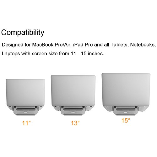 -. Feature : Premium Aluminum Stand provides stability for New MacBook Pro (2017/2016) / MacBook Air / MacBook, iPad Pro and all Tablets, Notebooks, Laptops with screen size from 11 - 15 inches. / Single piece premium aluminum design provides solid stability. / Full vented allows safe heat disbursement. / Foldable and Portable design makes it convenient to carry, just put the stand in your backpack or in your laptop bag. / Anti-slip feet keep your laptop in place and protect any surface it is placed on.