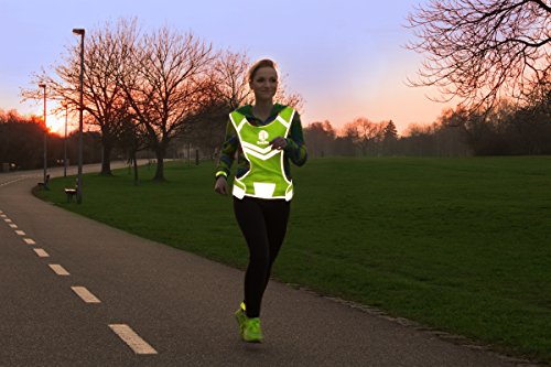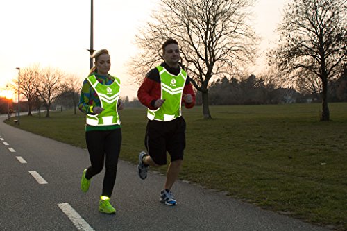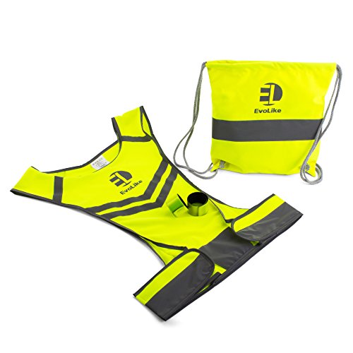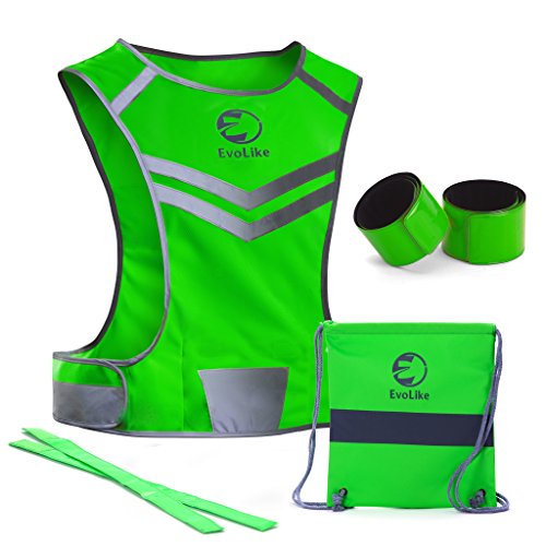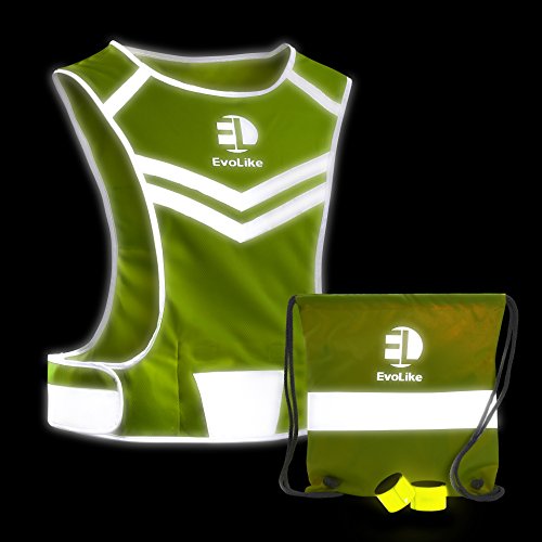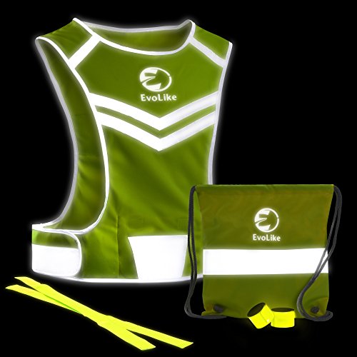 Reflective Vest EvoLike of Unique Design for Running Walking Cycling Jogging Motorcycle with Pocket + 4 High Visibility Wristbands + Bag (Fluorescent Green, Size S/M)