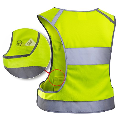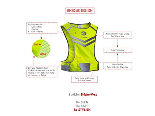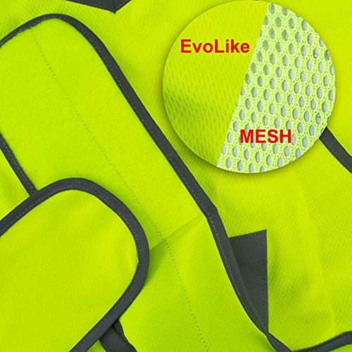 Reflective Vest EvoLike of Unique Design for Running Walking Cycling Jogging Motorcycle with Pocket + 4 High Visibility Wristbands + Bag (Fluorescent Yellow, Size L/XL)