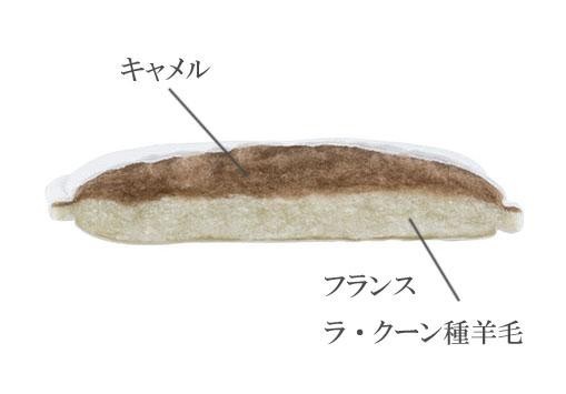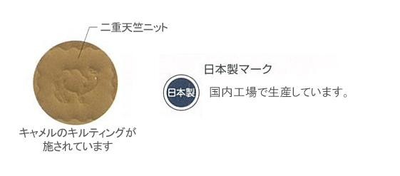 | 素材・材質 | ●詰め物 上層:キャメル100% 下層:ウール100% ●側生地 表地:綿100%(二重天竺ニット) 裏地:綿100%(スムースニット) |