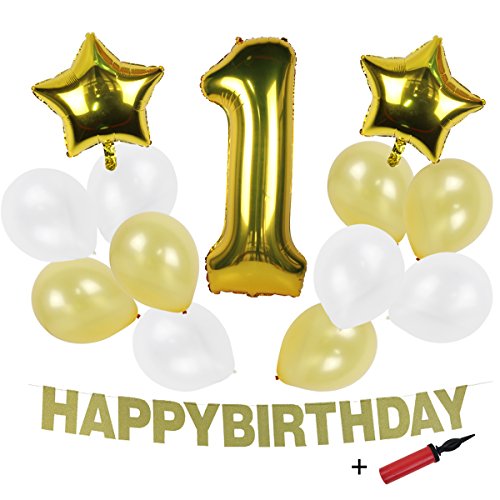 -. Feature : 大きめ華やかな可愛いバルーンとバースデーガーランドの1歳誕生日飾り付け14点セットです。 / サイズ(空気入れた後):数字1:85cm*30cm、ゴールド星:幅45cm、英文字ガーランド:長さ約3m(調整可)、ゴールドとホワイトバルーン:直径約30cm。 / 付属した空気入れでバルーンを膨らせて、粘着シールで壁で貼ったり、天井から吊ら下がったり、簡単に装飾できます。※長期間にわたる貼付は壁を傷つける恐れがあります。 / ドアや壁を飾り、パーティーのテンションを上がって、写真の背景にもなります。 / ごゆっくり空気を注入してください。過度の空気注入で破れることもご注意ください。壁を傷つかないため、両面テープの粘着力がそんなに強くないです。 軽いアルミ風船だけ適用です。あらかじめご了承下さい。