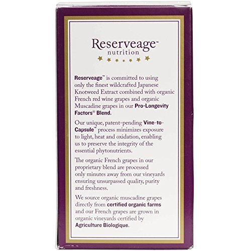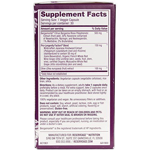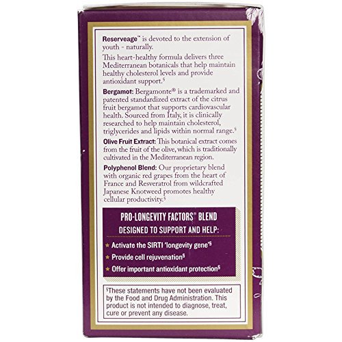 -. Feature : HEART HEALTHY FORMULA: This heart-healthy formula delivers three Mediterranean botanicals that help maintain healthy cholesterol levels already within the normal range and provides antioxidant support. / BERGAMOT: Bergamonte is a trademarked and patented extract of the citrus fruit bergamot that supports cardiovascular health. Sourced from Italy, it is clinically researched to help maintain cholesterol, triglycerides and lipids within normal range. / PRO-LONGEVITY BLEND: Organic trans-Resveratrol is combined with French grapes in our proP.R.Ietary Pro-Longevity Factors Blend, processed only minutes away from our vineyards, ensuring unsurpassed quality, purity and freshness. / VINE TO CAPSULE: Our unique, patent-pending, Vine-to-Capsule process minimizes our grapes' exposure to light, heat and oxidation, enabling us to preserve the integrity of the essential phytonutrients. / PROMOTE + NOURISH WELLNESS: What is Reserveage's Mission? To promote and nourish wellness - one body, one goal, one solution at a time in a way that incorporates sustainability and equal opportunity for wellness.