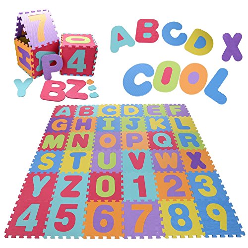 Alphabet and numbers with different assorted color. Help kids learn alphabet and numbers while playing 36 interlocking pieces with removable alphabet and numbers for educational play Perfect for kindergarten, nursery room, playroom, classroom or gyms. As floor mats or room decoration or other outdoor activities