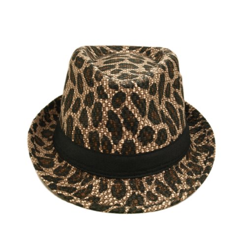 -. Title : Unisex Dark Brown Leopard Print Black Band Fedora Straw Hat