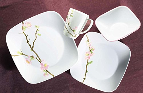 Amazon.com Review Part of the impeccably modern Corelle Square collection, Cherry Blossom dinnerware has a spare beauty reminiscent of a Japanese print. Fashioned by Studio Levien of London, the pattern features softly geometric silhouettes in white with a lovely cherry blossom motif artistically placed. Slight coupe shaping creates a nice dynamic on the plates, while subtle angles energize the typically rounded pieces like bowls and mugs. Durable enough stoneware for everyday use, Cherry Blossom also dresses up easily for parties or romantic dinners. The place to start a Cherry Blossom collection, this set includes four place settings, each with a 10-1/4-inch dinner plate, a 8-3/4-inch salad plate, a 22-ounce soup bowl, and an 11-ounce mug. With 16 pieces in all, the set is safe in the dishwasher, microwave, and oven for maximum convenience and comes with a 3-year replacement warranty. --Emily Bedard What's in the Box: 4 place settings. Each place setting consists of: 10-1/4-inch dinner plate; 8-3/4-inch salad plate; 22-ounce soup bowl; 11-ounce mug. 16 pieces total.