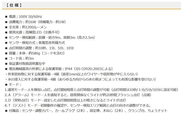 | センサー機能をお好みのモードに設定できます。お客様のお出迎えや防犯対策、常時点灯で夜間の作業などにオススメです。付属のクランプで取り付けも簡単にできます。付属のセンサー調整カバーで検知範囲を縮小できます。 |