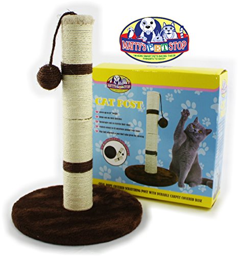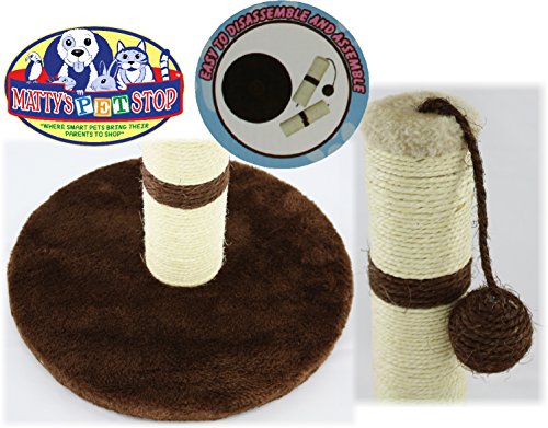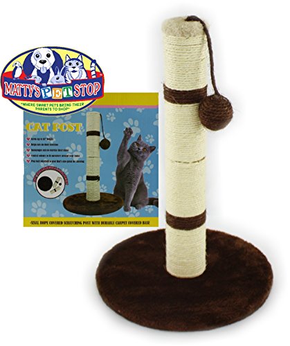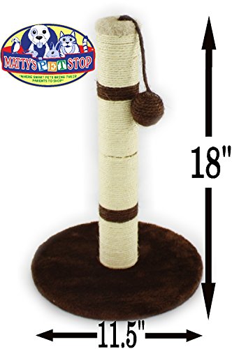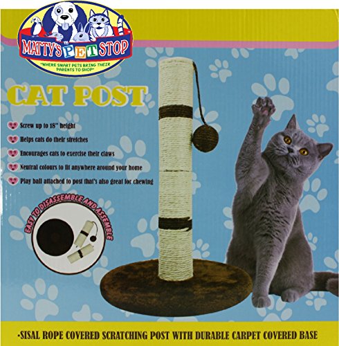 Studio : Homeware Publisher : Homeware Binding : Misc. Product Description Matty's Pet Stop 18" Sisal Cat Scratching Post with Play Ball and Carpet Covered Base - Tan and Brown, is AWESOME! The natural sisal fiber rope of the central post has the scent and rough texture that encourages scratching, the ball toy swings to keep your pet interested in swatting it around, and the base is covered with soft, plush carpeting that's ideal for taking a nap on. Cats with good scratching posts are less likely to claw furniture or curtains, and fun, engaging toys can prevent other behavioral problems as well. So treat your both kitty and yourself to this great gift! This sturdy 18 inch tall scratching post with a hanging play ball is easily assembled in seconds. It comes in 3 parts for easy storage. Scratching Post Measures 18" Tall x 11.5" Wide x 11.5" Deep 0
