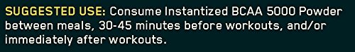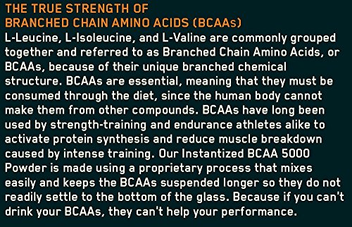Instantized BCAA 5000 Powder At a Glance: |  | Instantized formula mixes easily with a spoon |  | Supports muscle building and recovery efforts | | ? | | ? |  | Milligrams of total BCAAs: 5,000 |  | 2.5 grams of leucine; 1.25 grams of isoleucine; 1.25 grams of valine | | ? |