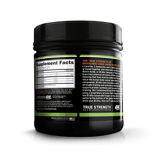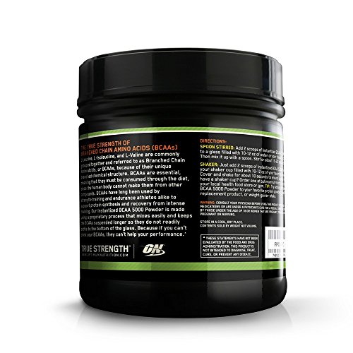Studio : Optimum Nutrition Publisher : Optimum Nutrition Binding : Health and Beauty Product Description Each serving of ON Instantized BCAA 5000 Powder provides a 5,000 mg (5 g) blend of the three Branched Chain Amino Acids (L-Valine, L-Leucine, and L-Isoleucine) in every serving. The Branched Chain Amino Acids (BCAAs), so named because of their branched chemical structure, are essential in that the body cannot make them from other compounds. The method to produce ON Instantized BCAA 5000 Powder yields a powder that mixes readily in water or juice and does not readily clump or settle to the bottom. As a result, the difficulty in mixing you may have experienced with other BCAA powders is greatly reduced. 0