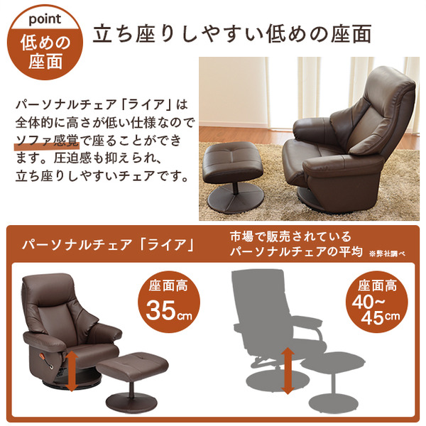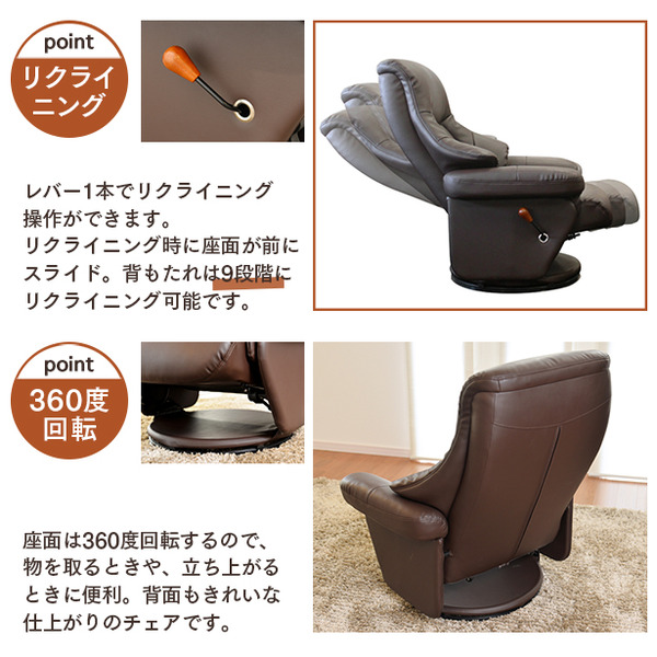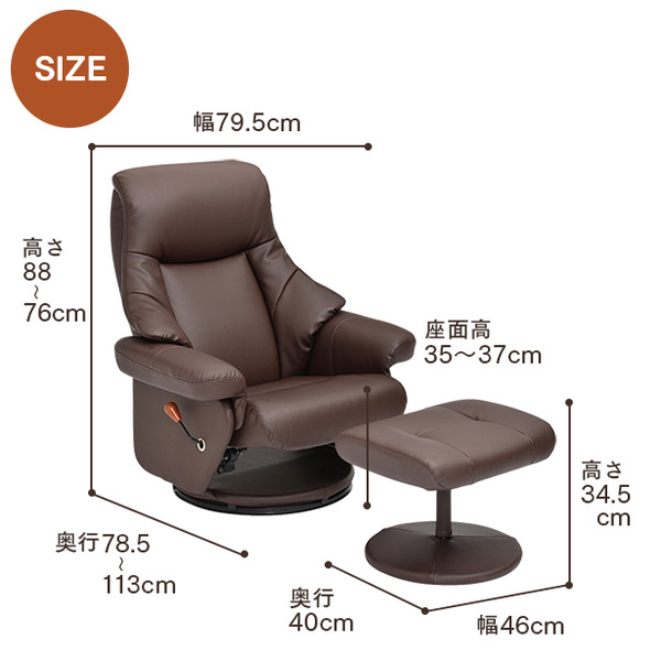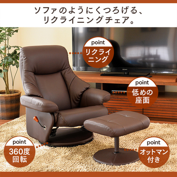 本商品はお取り寄せ商品のため、稀にご注文入れ違い等により欠品・遅延となる場合がございます。誠に恐れ入りますが、何卒ご了承ください。 また、以下の場合には追加送料がかかる場合がございます。  ・大型商品の複数購入時 ・同梱区分が異なる商品の複数購入時  【出荷目安】:1 - 4営業日 ※土日・祝除く 【同梱区分】:TS 2053 【梱包サイズ】:大型商品 【代引き決済】:不可  配送伝票の依頼主は出荷元(メーカーもしくは仕入元)名となる場合がございますので、お受け取りの際はご注意ください。   全体的に高さが低い仕様なので、 ソファ感覚で座ることができます。レバー1本でリクライニング操作ができます。 リクライニング時に座面が前にスライド。 背もたれ9段階にリクライニング可能です。 圧迫感も抑えられ、立ち座りしやすいチェアです。 【注意事項】 ●直射日光の当たる場所又は熱・火は避けて下さい。 ●必ず本来の用途だけにご使用下さい。 ●水平を保てる場所に設置し、ご使用して下さい。 ●こちらは一般家庭向け商品となり業務使用を前提とした構造になっておりません。  【サイズ】チェア:幅79.5×奥行78.5~113×高さ88~76cm(座面高35~37) オットマン:幅46×奥行40×高さ34.5cm  【重量】約20kg  【梱包サイズ】幅108×奥行68×高さ74cm  【商品組立の有無】組立て品  【張地】U-PVC  【中材】ウレタン・スチール   【ご注意事項】 ・商品の組み立て開始前に部材不足、破損がないか必ずご確認ください。 【ご注意事項】 ・商品注文後のキャンセルや返品は承りかねます。 ・本商品は、北海道・沖縄・離島への配送はいたしかねます。あらかじめご了承ください。