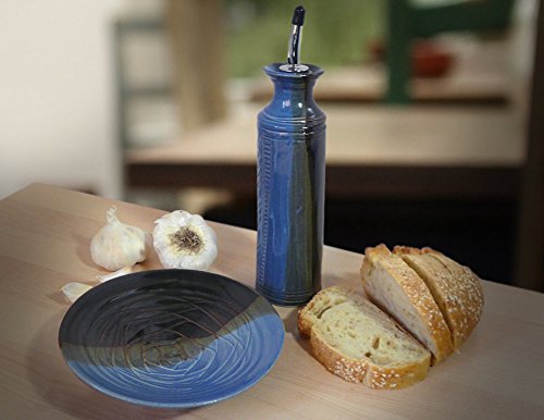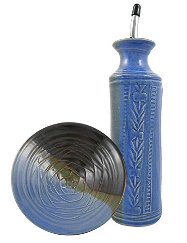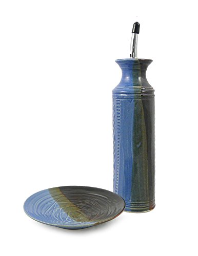 -. Feature : Durable stoneware clay with a blue/green/brown 'lakeside' glaze color / Set includes 1 dipping dish and 1 cruet for olive oil, vinegar, or oil mixture / Features a chrome cruet stopper with rubber gasket and American-made glaze that is lead-free and cadmium-free / Cruet is dishwasher safe - dipping dish is dishwasher, oven, freezer, and microwave safe. / Handcrafted in the USA