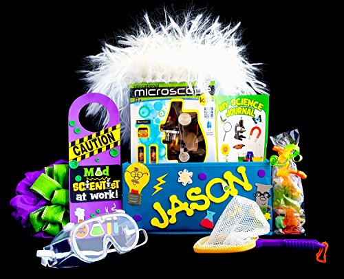 -. Title : Microscope Gift Set Personalized - Educational Microscope Kit, Plastic Safety Science Googles, Mad Scientist Wig, Bug Net, Door Hanger and Science Journal