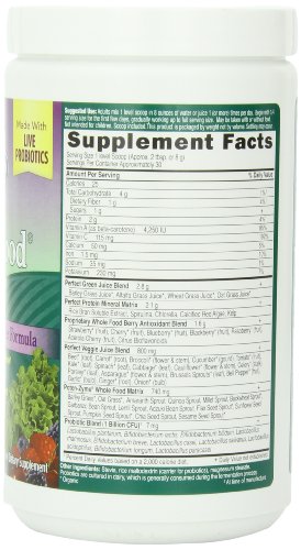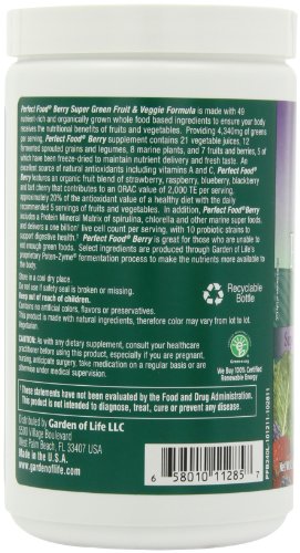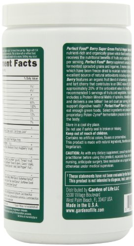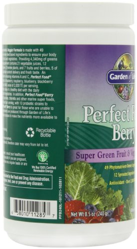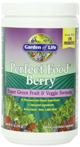 -. Binding : Health and Beauty -. Brand : Garden of Life -. EAN : 0795186391751 -. Feature : 17 organic vegetable juices, 12 fermented sprouted grains, seeds, and legumes, 8 marine plants, 7 whole fruits and berries / Fermented and unfermented young cereal grass juices (organic barley, organic alfalfa, organic oat, organic wheat) / Excellent source of natural antioxidants including vitamins A and C. / Provides an ORAC (Oxygen Radical Absorbance Capacity) value of 2,000 TE per serving / Made with one billion live probiotic cells¹ to support digestive health. -. IsAdultProduct : 0 -. IsAutographed : 0 -. IsMemorabilia : 0 -. Label : Garden of Life -. LegalDisclaimer : * These statements have not been evaluated by the Food and Drug Administration. This product is not intended to diagnose, treat, cure or prevent any disease. **Always refer to the manufacturer's label on the product for description, recommended dose and precautions. -. Manufacturer : Garden of Life -. Model : ba-boo-byi-com893 -. MPN : 101187 -. NumberOfItems : 1 -. PackageQuantity : 1 -. PartNumber : 101187 -. ProductGroup : Health and Beauty -. ProductTypeName : HEALTH_PERSONAL_CARE -. Publisher : Garden of Life -. ReleaseDate : 2007-12-05 -. Size : 240 g -. Studio : Garden of Life -. Title : Garden of Life Perfect Food Berry, 240g Powder -. UPC : 811120718627