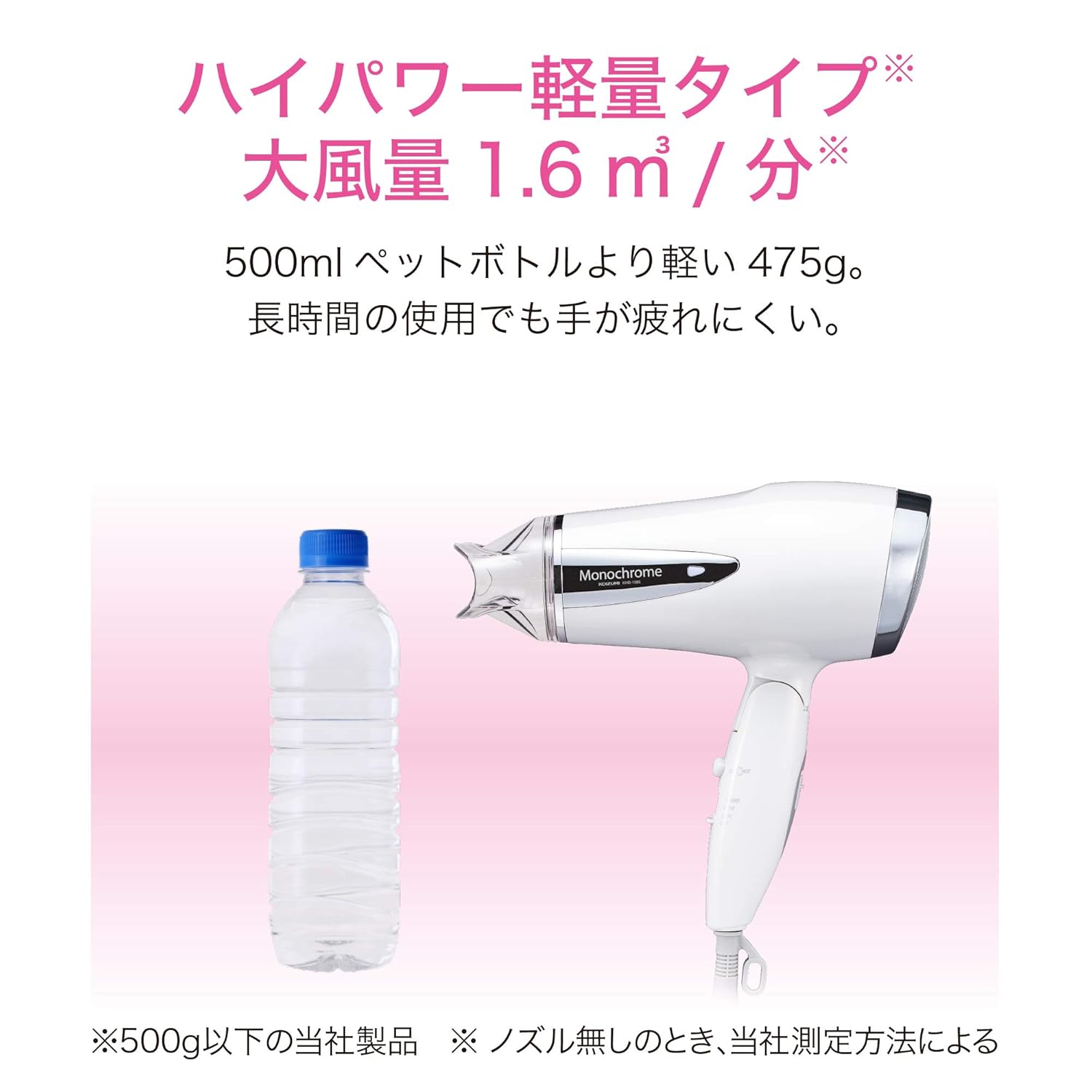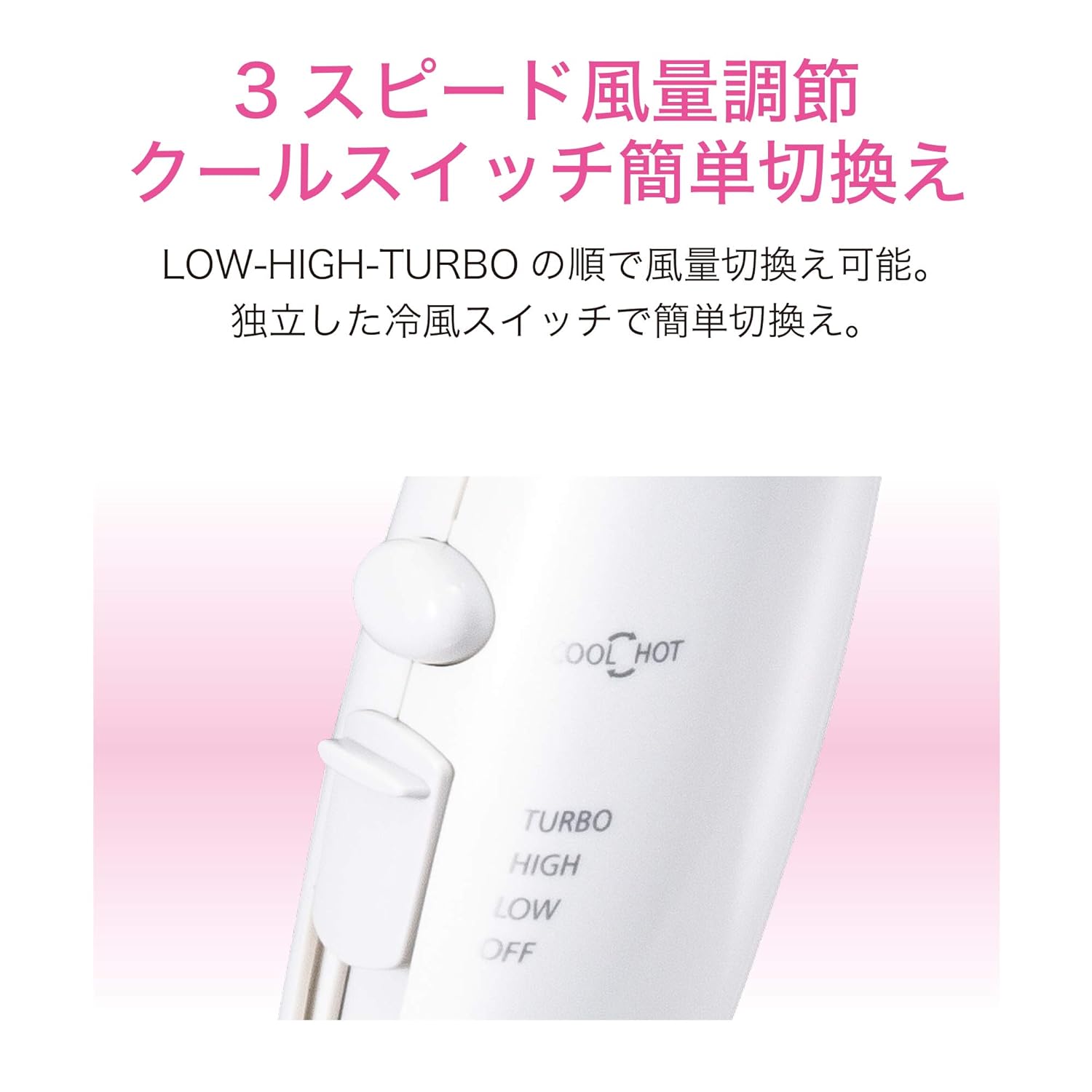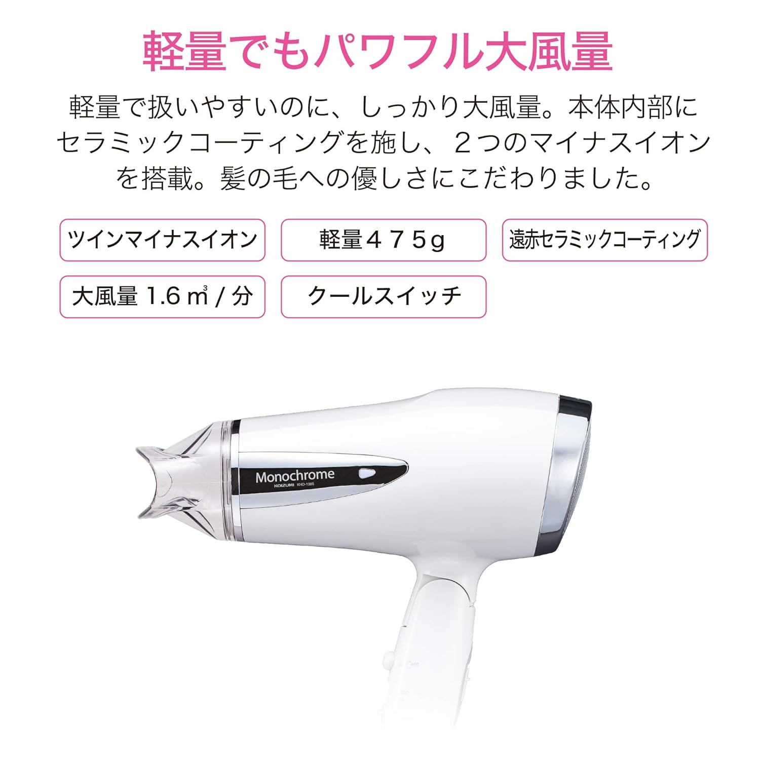 サイズ:幅23.1×奥行9.4×高さ21.7cm 電源:AC100V 50/60Hz 消費電力:1200・600W切換え式 付属品:取扱説明書(保証書付) メインスイッチ:TURBO-HIGH-LOW-OFF 本体重量(kg):0.475