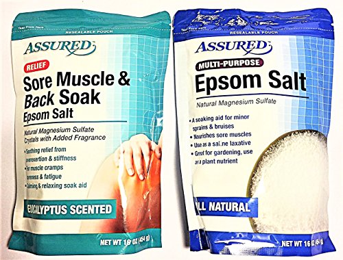 ASSURED EPSOM SALT BUNDLE OF 2 BAGS: 1 - 16 oz. bag of Eucalyptus sore muscle and back soak and 1 - 16 oz. bag of all natural multi-purpose epsom salts.