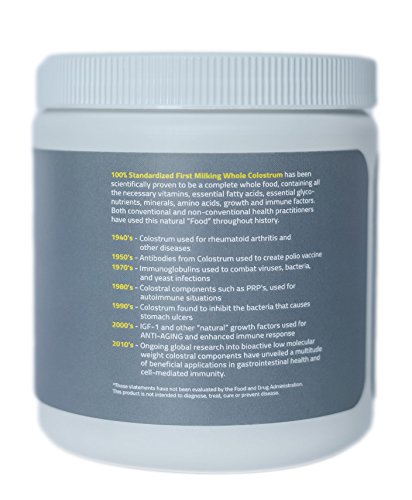 -. Feature : True 100% First Milking Colostrum derived from carefully selected USDA Grade A Diaries - Made in USA! / Highest potency and grade of Bovine Colostrum on the market / Certified Hormone, Antibiotic & Gluten Free / Strengthens the Immune System - Research shows benefit to GI tract disorders, autoimmune disease, reduced oxidative stress thus is anti aging and naturally increases lean muscle mass / Spray dried at low temperatures to insure optimum nutritional integrity