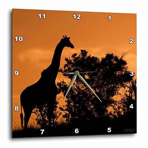 Giraffe near Acacia Tree sillouetted against the sky at sunset. Serengeti National Park, Tanzania Wall Clock is a wonderful complement to any room in your home or office. Made of durable high grade aluminum. This frameless clock has a high gloss mirror like, UV coated, scratch resistant finish and is suitable for a moist environment. Measures 6" x 6" and requires one AA battery; not included. Battery box is not covered.Feature