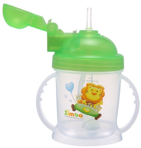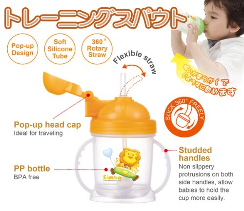 -. Feature : Pop-up lid, ideal for traveling, safe and hygienic. / Flexible 360° auto straw, drinking from all angle. / Simba PP bottle is made of FDA approved food grade PP material, BPA Free! / Handles for easy gripping