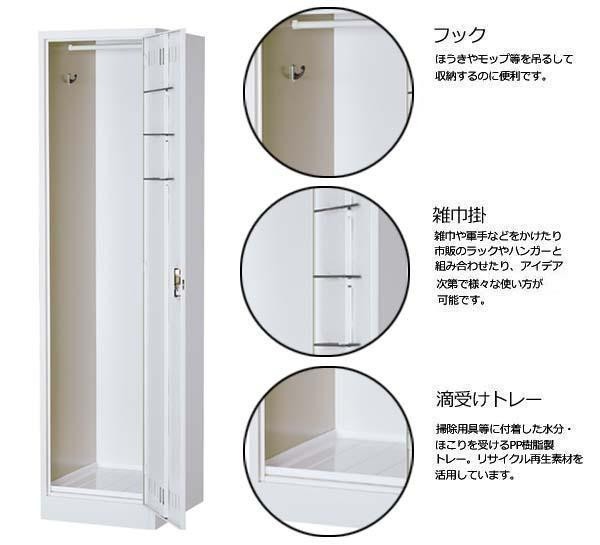 | ほうきやモップなど背の高い掃除用具から雑巾・洗剤・バケツなどの小物類まで☆掃除用具の収納に最適なロッカーです。インテリアに馴染みやすいカラーは、オフィスや店舗などへの設置にピッタリ☆ |