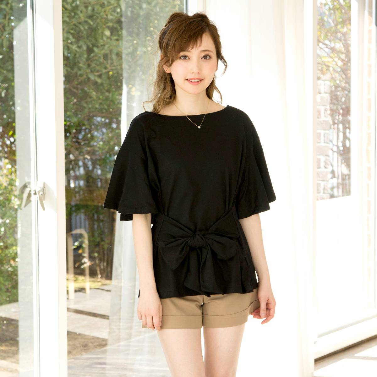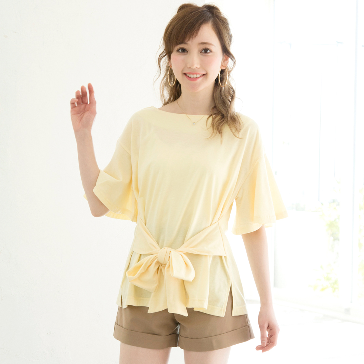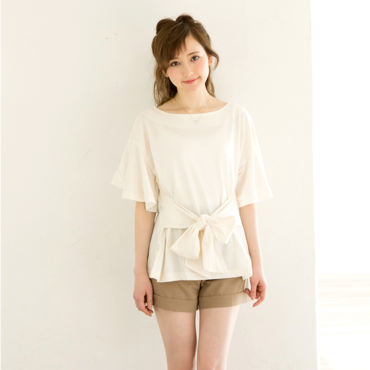 ウエストマークとなる大きめのリボンがポイント。生地表面もなめらかで幅広いアイテムと合わせられます。トレンドカラーからベーシックまで豊富なカラバリ。ハイウエストのボトムと併せて脚長効果も。