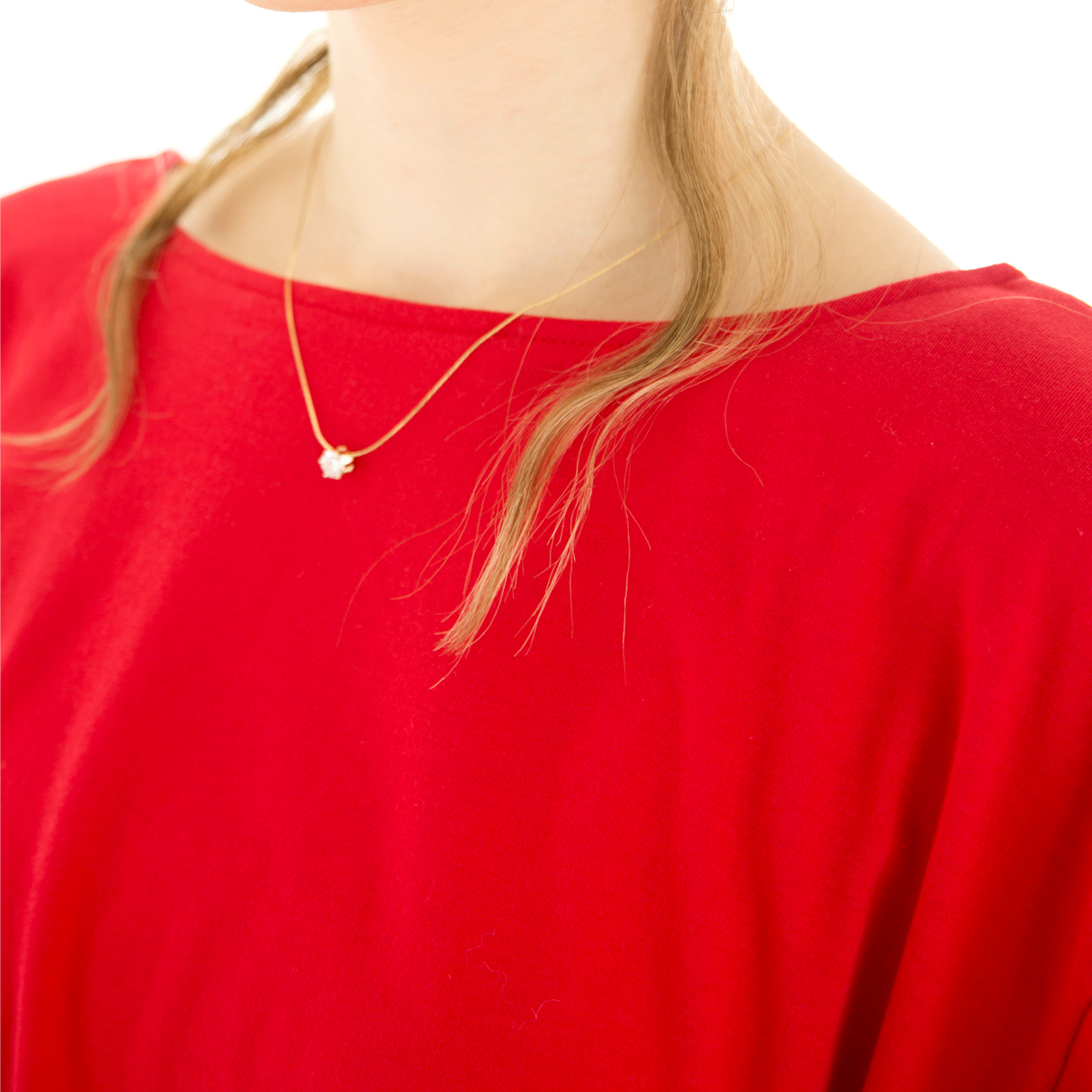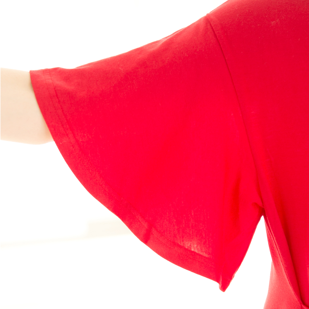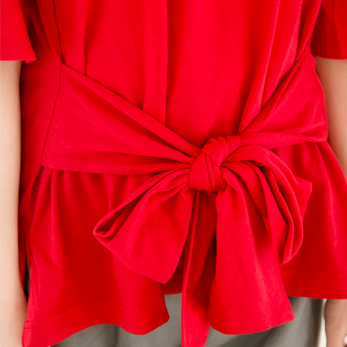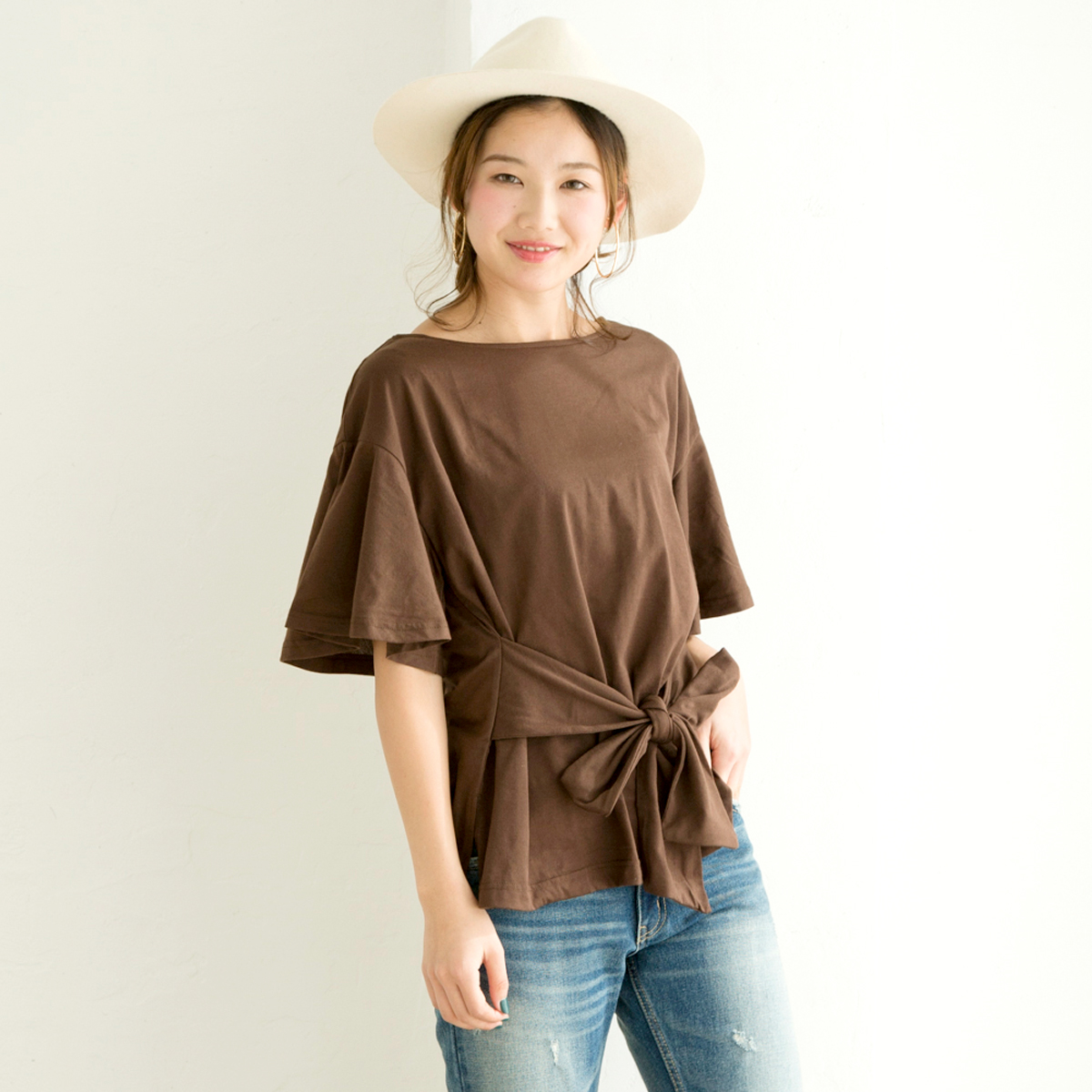 ウエストマークとなる大きめのリボンがポイント。生地表面もなめらかで幅広いアイテムと合わせられます。トレンドカラーからベーシックまで豊富なカラバリ。ハイウエストのボトムと併せて脚長効果も。