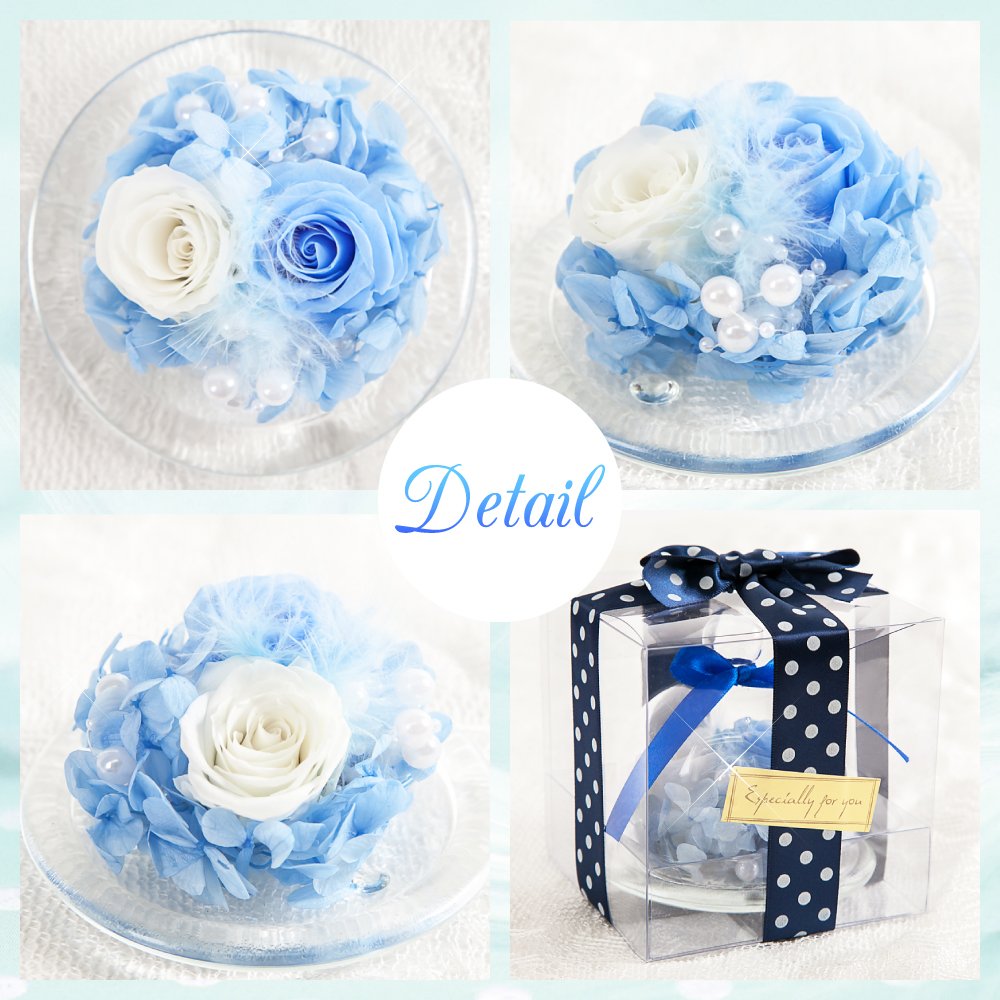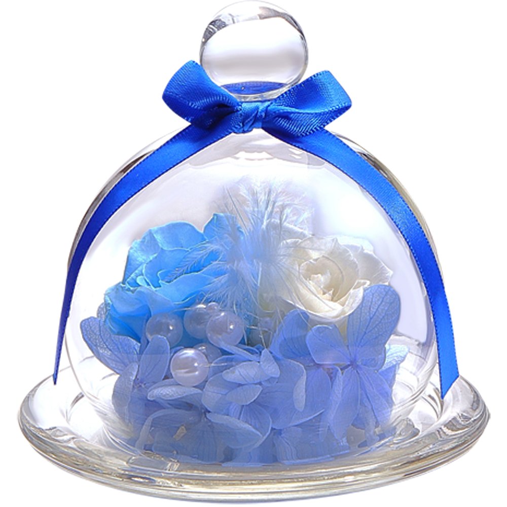 2~3cmのスカイブルーのバラ1輪と白のバラ1輪、紫陽花、羽根、パールビーズでアレンジしたガラスドームアレンジ。小さめのガラスポットの中にお花がいっぱい詰め込まれているTEATSIGHTオリジナルのアレンジです。