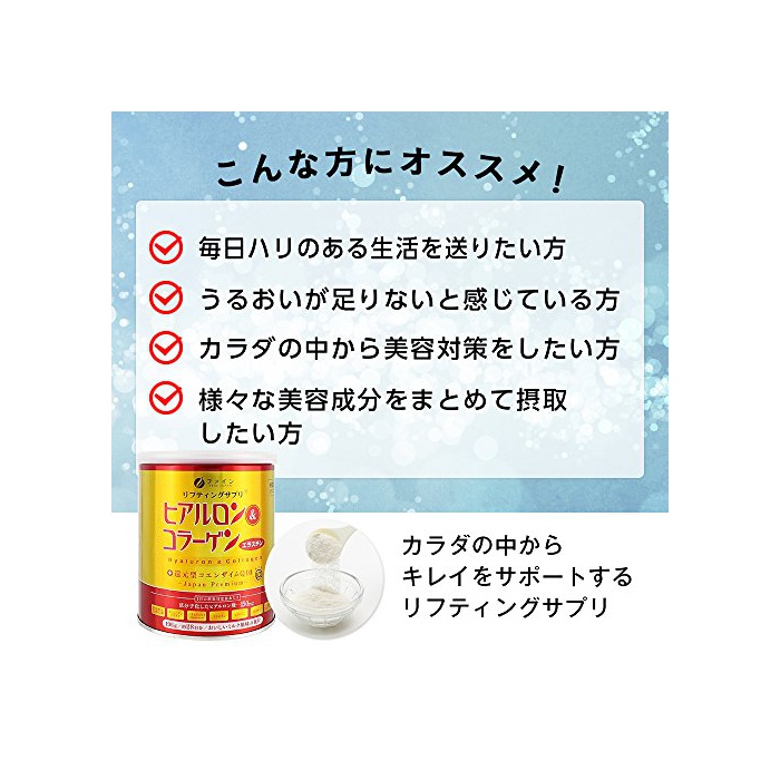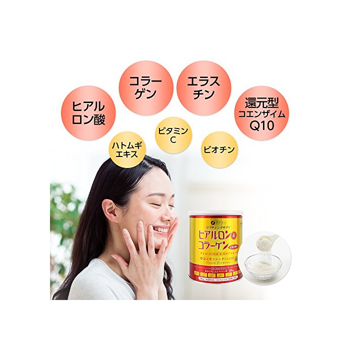 원재료 : 어콜라겐 펩티드,연유 파우더,비둘기《무기에키스》,엘라스틴 펩티드,코엔자임Q10(환원형)고, 덱스트린,트레이닝 헬로《스》,히알론산,비타민C 고, 향료,감미료(《스쿠라로스》)고, 《비오친》(원재료의 일부에 젖,대두를 포함한다)