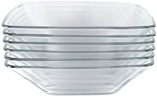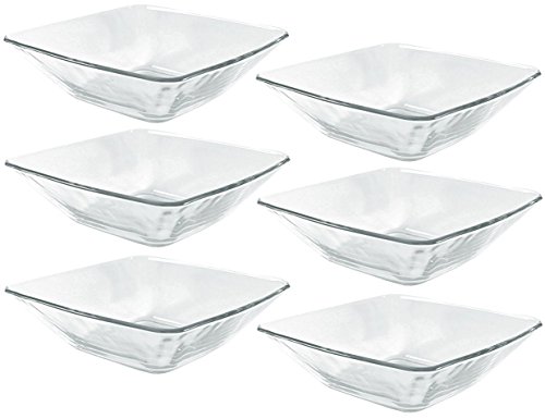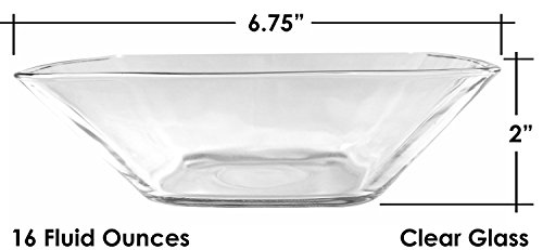 Set of Six 6.75" square glass salad bowls perfect for everyday use. Used by many restaurants and professionals, these bowls are dishwasher and microwave safe. Durable tempered glass. Safely holds 16 fluid ounces.