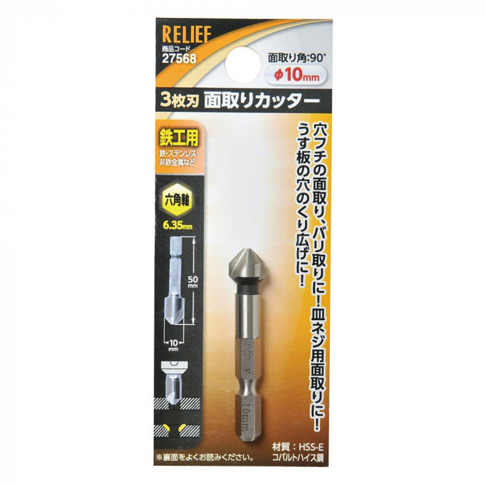 fk094igrjs穴フチの面取り、バリ取りに最適うす板の穴のくり広げにも使える面取りカッターです サイズ Φ10mm、全長:50mm 個装サイズ:5×12×3cm 重量 個装重量:30g 素材・材質 コバルトハイス鋼(HSS-E) 仕様 鉄工用 六角軸(平径6.35mm) 面取り角度:90度 製造国 中国 鉄工用の面取りカッター 穴フチの面取り、バリ取りに最適うす板の穴のくり広げにも使える面取りカッターです