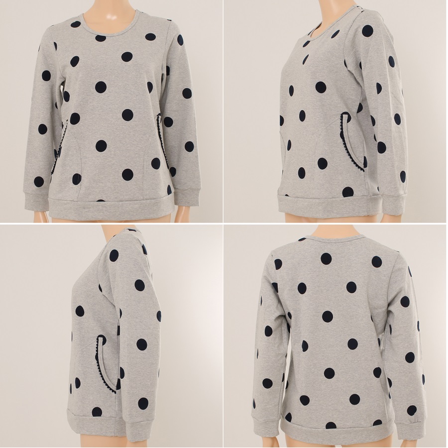 멜란 그레이컬러의 쮸리원단에 네이비 도트 나염을 올 린 키치한 스타일의 제품입니다.