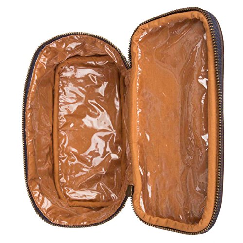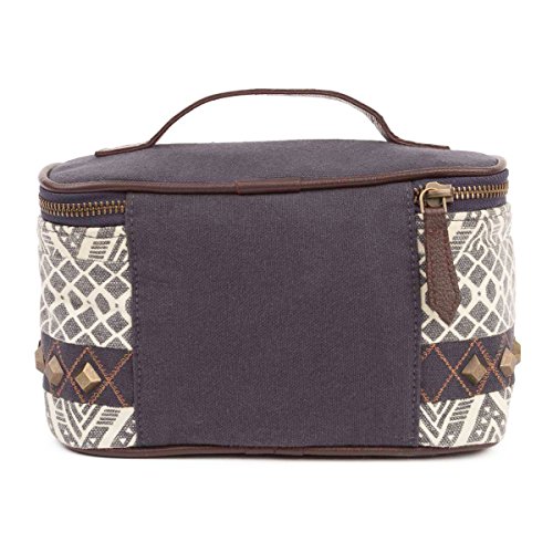 Product Description Makeup is messy. Solve the problem with our easy-to-clean Brooke Cosmetic Case. Go for a modern, yet classic look with Brooke's enzyme washed canvas print with its eye-catching geometric pattern. Featuring shades of winter pear, indigo, and caramel with a genuine coffee brown leather carrying handle and antique brass studs. Includes vinyl lining for easy cleaning. FEATURES ? Assorted Fabrics ? Machine stitched ? Enzyme-washed canvas fabric with various geometric prints in winter pear and indigo ? Solid indigo canvas strip contains caramel chain stitching and antique brass metal studs, both diamond in shape ? Lined in solid caramel cotton fabric with protective vinyl covering ? Handle and trim in coffee brown leather ? Antique brass hardware SPECIFICATIONS ? Dimensions: H4 Base: W8xD4.5 (in) ? 1 carrying handle ? Approximate Weight: 0.45 (lb) ? Material: 100% Cotton shell exclusive of embellishments ? Made in India CARE ? Spot clean only, no chlorine bleach. 0