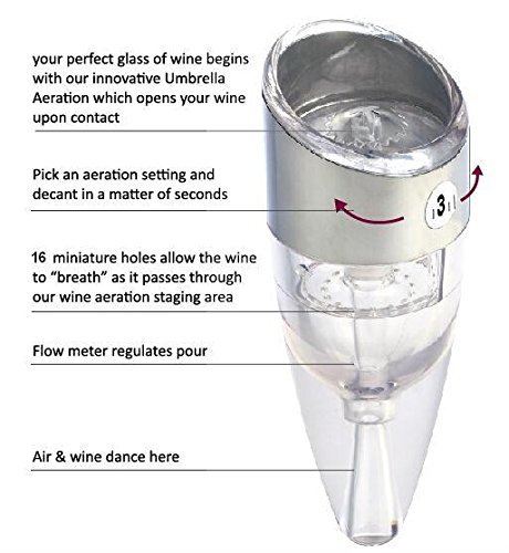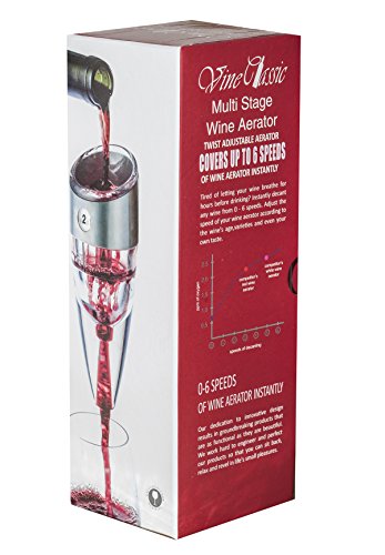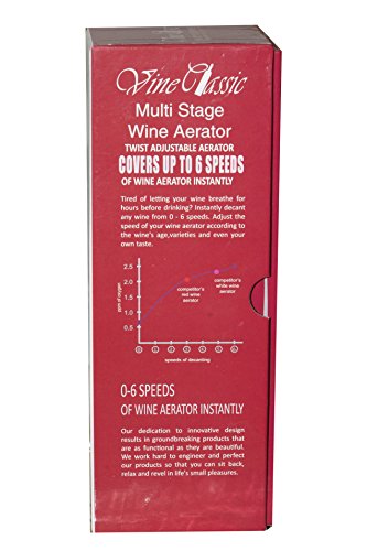 -. Brand : VineClassic -. EAN : 0718117847073 -. Feature : 6 SPEEDS of WINE AERATION! Simply twist the stainless steel band to increase or decrease the speed of decanting depending on type of wine! Creates a much desired noticeable difference in flavor and presentation - you'll actually hear the wine aerate! / DECANT UP TO 6 HOURS - INSTANTLY! One does not decant a Pinot the same as a Merlot. Other aerators have just one setting. With a Pierce Logan Gourmet Aéré Decanter, you have six! Now you can have zero to six hours decantation control - instantly! / FLAWLESS BEAUTY AND FUNCTIONALITY. A sleek band of FDA Approved stainless steel wraps around the seamless exterior. BPA-free acrylic and food grade silicone ensures a perfect seal without leaking. Grip it any way you choose without blocking air. / Handheld foil cutter effortlessly prepares wine bottles for serving with its 4-wheel system with razor-sharp blades quickly removes foil from wine bottles -. Label : VineClassic -. Manufacturer : VineClassic -. Model : 5607 -. MPN : 5607 -. PartNumber : 5607 -. ProductGroup : Kitchen -. ProductTypeName : KITCHEN -. Publisher : VineClassic -. Studio : VineClassic -. Title : Adjustable Wine Aerator Decanter, Plus a Wine Foil Cutter -. UPC : 718117847073