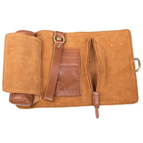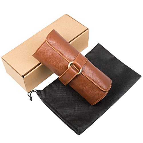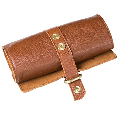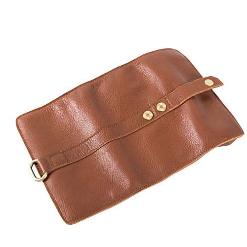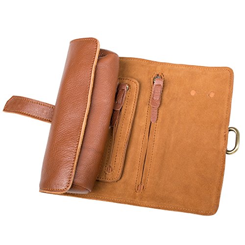 ANCICRAFT Soft Genuine Leather Handmade Roll up Pencil Pen Mark Case Holder Wrap Pouch Bag Organizer with Zipper and Snap Closure (Brown)