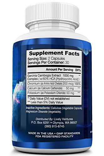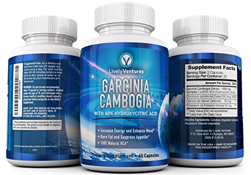 -. Feature : GARCINIA CAMBOGIA EXTRACT 1000mg Powerful Pure and Potent! Are You Looking for the All Natural way to Combat Fat, Suppress Appetite and lose weight? Could you use just a little Edge? Would you like to feel the Results Everyone is Talking About? Be Happy, Be Healthy, Be Natural and Try Lively Ventures Brand Garcinia Cambogia. GET THE EDGE on your health goals. Lose that Stubborn Fat. Boost your Mood, Block Carbs, and Curb your Appetite to Maintain your Heathy Lifestyle / BENEFITS: Known to Reduce Appetite by Increasing Serotonin Levels in the Brain making you more Content and Happy and Less Susceptible to Psychological Hunger. P.R.Imarily a Carb Blocker making it harder for your body to convert Excess Carbohydrates into Fat. And as a result feeling a boost of energy when taken regularly. / THAT'S RIGHT! Say good-bye to psychological hunger and say hello to a happier, healthier, more lively you! Imagine how great you will feel knowing that your body is busy blocking fat, boosting serotonin and decreasing your appetite / QUALITY MADE IN THE USA at an FDA Registered Facility. cGMP Certified All Natural. Rest assured that THIS BLEND of Garcinia Cambogia is made with the highest quality ingredients and 3rd party tested for potency. Non GMO, All Natural, Gluten free, non-allergenic, Gluten Free, NO Additives or Preservatives. / IF our brand does not work for you contact us immediately and we will work with you to make it right. We understand that supplements work very well for the vast majority of people and that not all people are the same. We are so confident in the quality & effectiveness that we offer a 100% NO RISK Money Back Guarantee.
