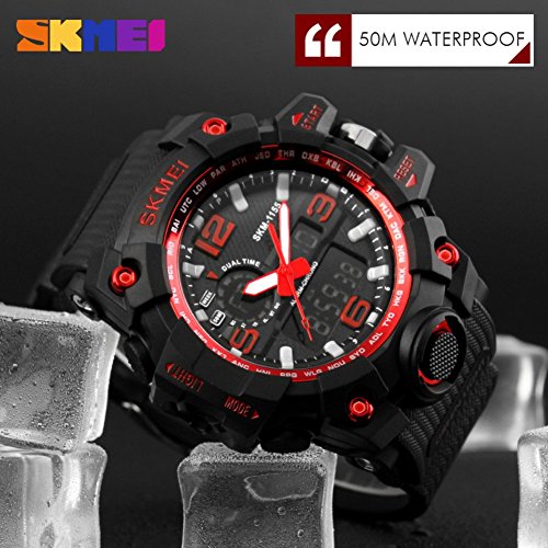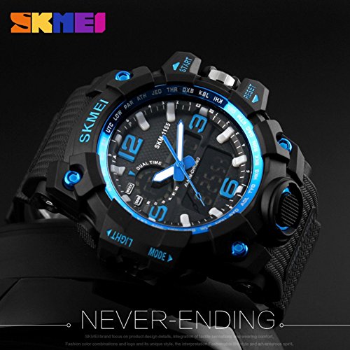 -. Feature : Japan original precise digital and quartz movements, dual time zone / Packaged with original sturdy box, best choice for gift / ABS high durable plastic and flexible PU silicone case, PU plastic watchband, 50 M professional waterproof, light with EL lamp / Displaying time with month, date, week, hours, minutes and seconds, alarm, stopwatch, 12/24 hours mode / Solid stainless steel back cover, long-time life Japanese battery