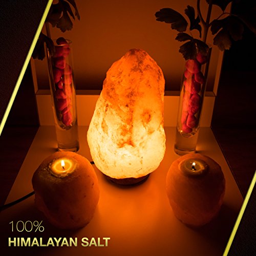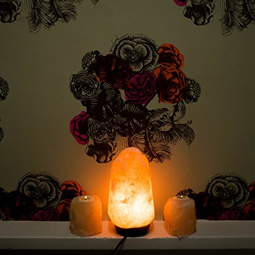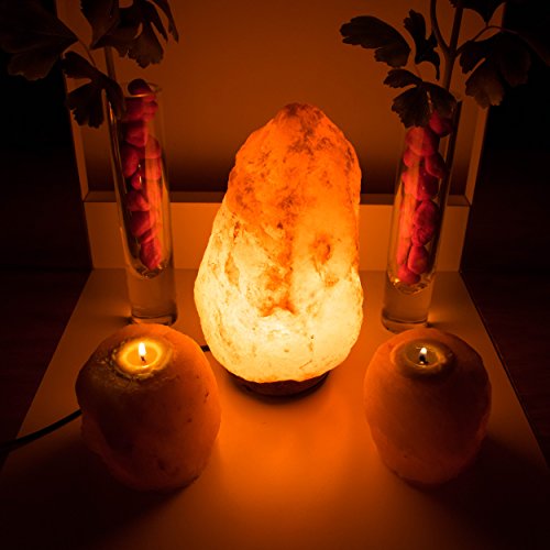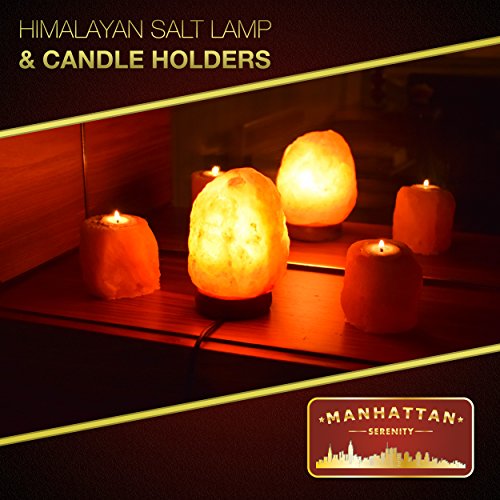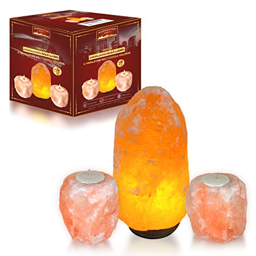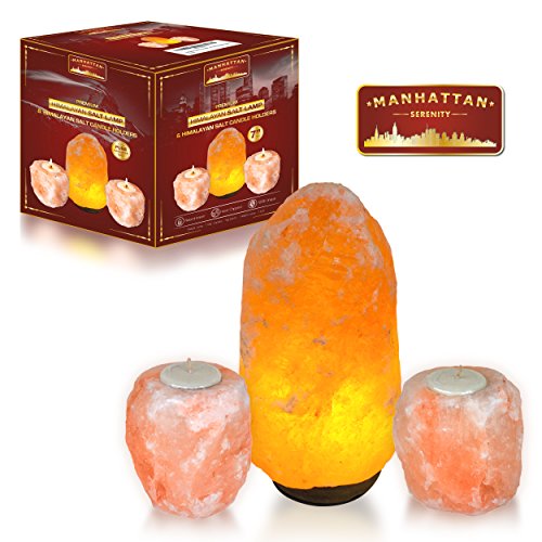 Manhattan Serenity Himalayan Salt Lamp & 2 FREE candle holders. seven īnch lamp with 6ft UL-Certified dimmer switch with 15 watt bulb on a wooden base. natural carve with matching candle holders