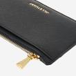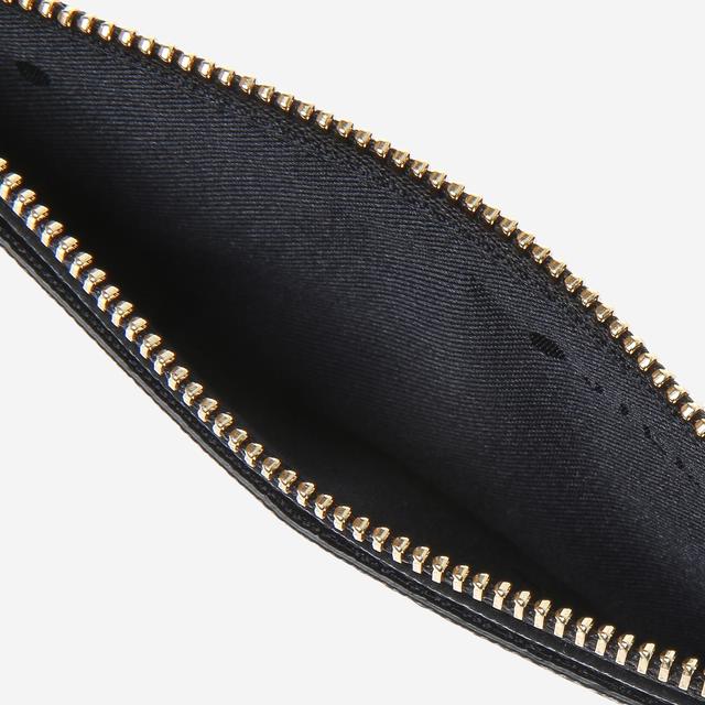 블랙 컬러 바탕에 골드 로고 레터링과 지퍼 장식이 고급스러운 카드지갑입니다.