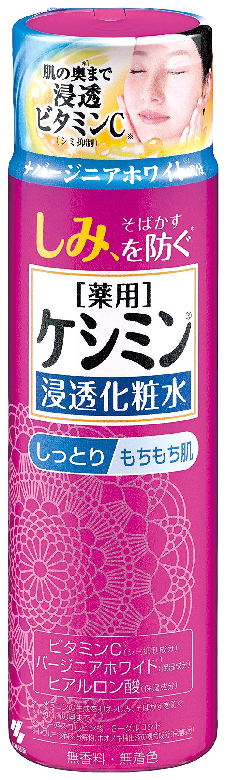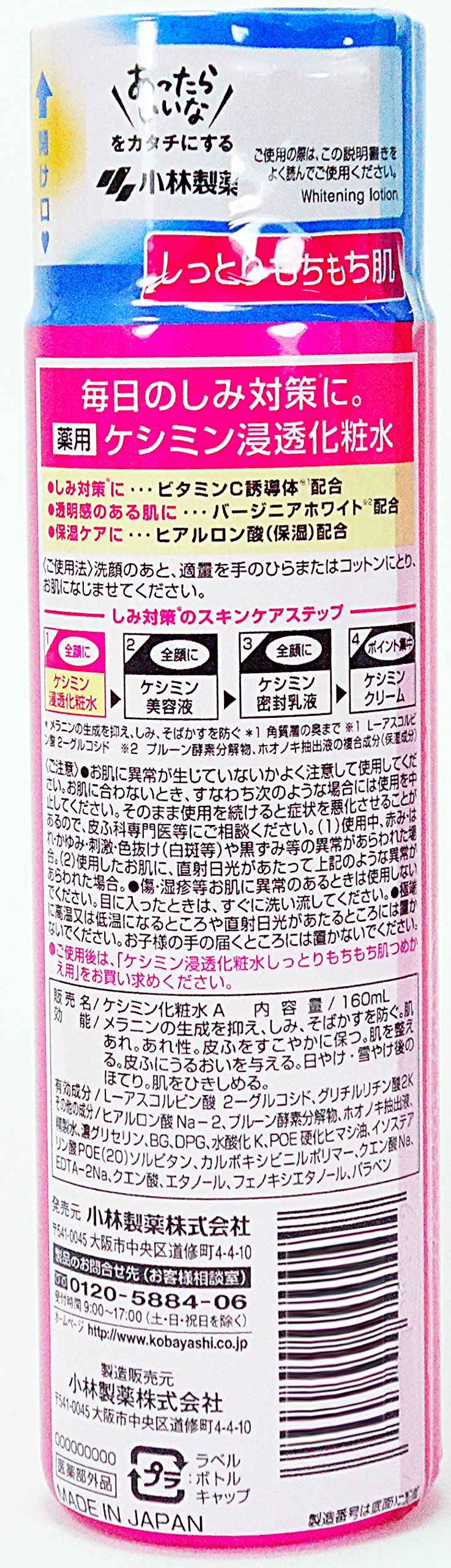 For countermeasures against spots on the entire face, a medicated lotion "Keshimin Liquid" that penetrates deep into the stratum corneum and suppresses the generation of melanin, which contains vitamin C derivative (spot control ingredient), and causes spots.