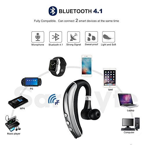 -. Feature : Stylish and compact design, smooth lines, simple and noble.The headset is lightweight and stable and the earplugs can rotate 180 degrees, suitable for the left and right ears, whether you are at work or in the gym is not easy to fall off, very comfortable to wear. / Bluetooth version 4.1,with built-in import high definition microphone . It can provide high-quality stereo audio experience no matter whether listening to music or making a phone call, the effect of sound is perfect. Equipped with mute button, support mute microphone, if you don't want the other party to hear your voic / Easy to use, easy to pair, control volume, start/stop the music, answer calls and move between songs.Supports Multipoint Technology,the wireless headset that work with all smartphone, tablets and music players. / Talking time:6-8 hours,playing time:6-7 hours, standby time:200 hours.1.5~2 hrs quick charge. / The bluetooth headset guarantee 12 months and 30 days no reason to return .