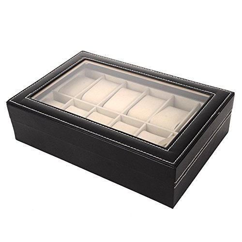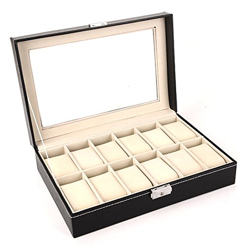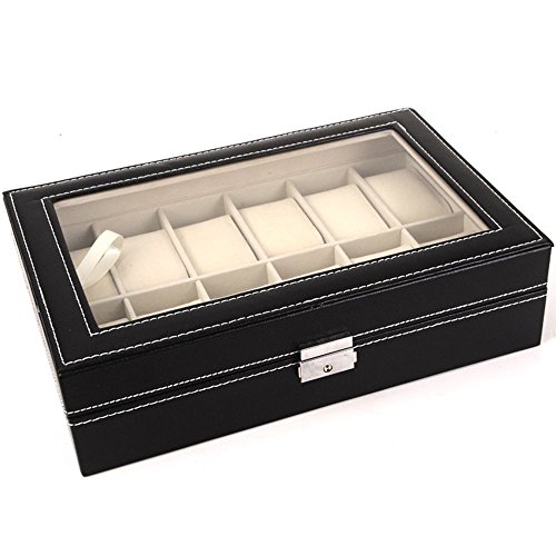 -. Title : GZNIGHT Watch Box Large 12 Slot Mens Women Black Leather Display Storage Glass Top Jewelry Case Organizer