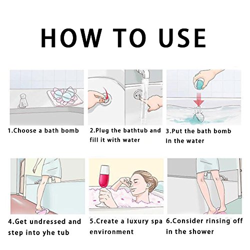 -. Feature : Premium quality: handmade, natural and organic, fresh and clean fragrances; moreover, bath bombs will never discolor your skin nor your tub as both can be easily rinsed clean / SIZE: A 2oz bath bomb is enough to freshen your bath. The silky water will soothe your skin and give you a spa-like experience. Just enjoy it ! / The bath bomb scents include lemon, rose, green tea, ocean, vanilla and lavender, all with longer-lasting perfuming effects / Function:The bath bombs make a wonderful gift for family or friends; ideal for birthdays, weddings, Mother's Day, Father's Day,Valentine's Day, Children's Day and more / Fun experience: The bath bombs melt quickly and you can relax yourself in the fizzing water.Just enjoy your bath time.