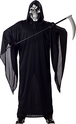 -. Binding : Apparel -. Brand : California Costumes -. ClothingSize : One Size -. Color : multi-colored -. Department : mens -. Feature : Medium (Fits size 40-42), Large (Fits size 42-44), Xlarge (Fits size 44-46) / Includes: Pullover robe has long draping sleeves and an attached hood, Mask has an elastic strap in back, Note: To fix folds in the mask caused by packaging, place a hair dryer in the back, a few inches from the vinyl and heat it until it returns to shape / Does not include scythe -. Genre : Classic -. Label : California Costumes -. Manufacturer : California Costumes -. Model : 1055 -. MPN : CC01055 -. PackageQuantity : 1 -. PartNumber : CC01055 -. ProductGroup : Apparel -. ProductTypeName : ADULT_COSTUME -. Publisher : California Costumes -. Size : One Size -. Studio : California Costumes -. Title : California Costumes Men's Grim Reaper Costume