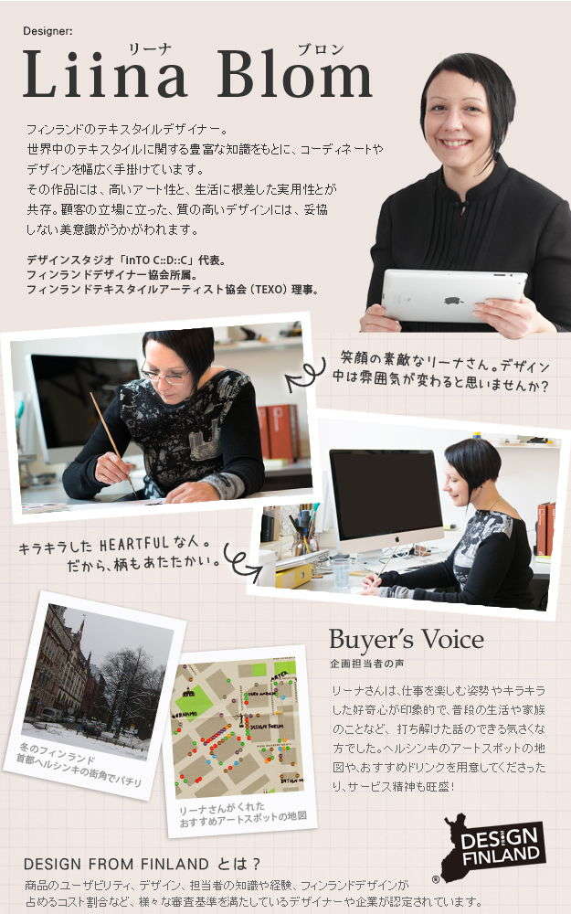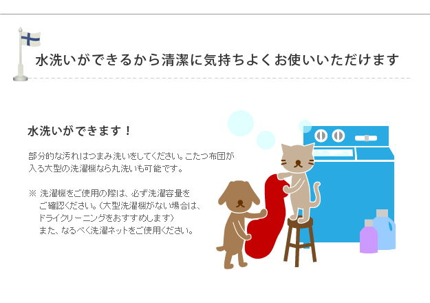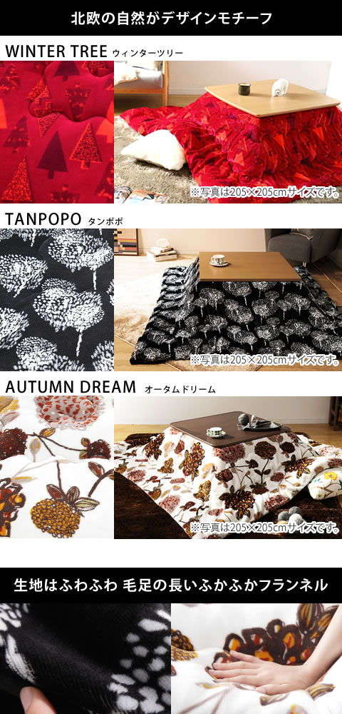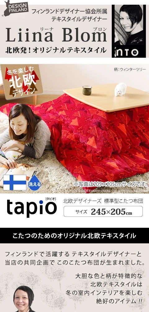 ●商品について:フィンランドを中心に活躍するテキスタイルデザイナーLiinaBlom(リーナ・ブロン)との共同企画により生まれたオリジナルの北欧柄ふっくらこたつ布団。大胆な色と柄が特徴的な北欧テキスタイルは冬を楽しむのにピッタリ。