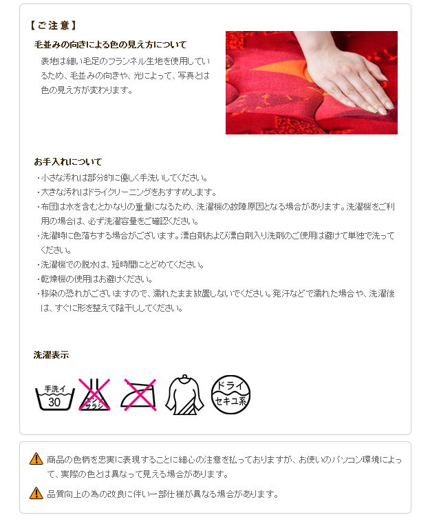 ●材質:表地-ポリエステル100%(フランネル)、裏地-ポリエステル100%(フリース)、中綿-ポリエステル100%