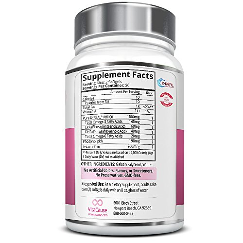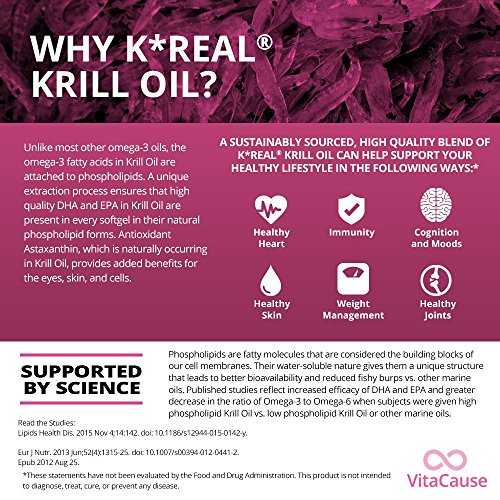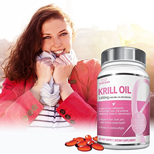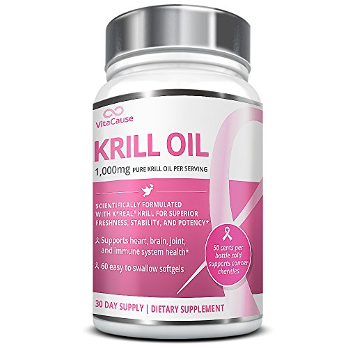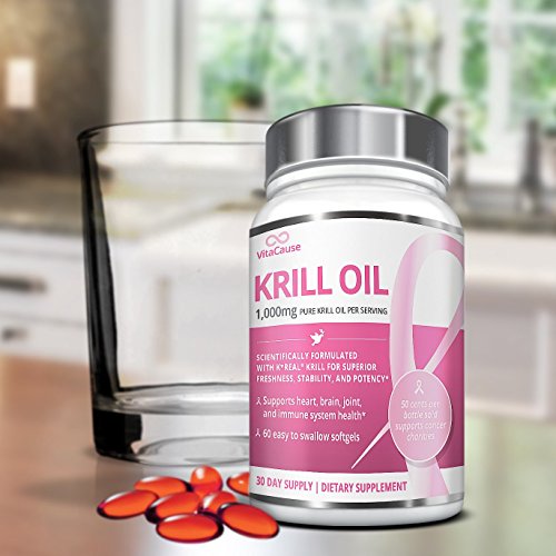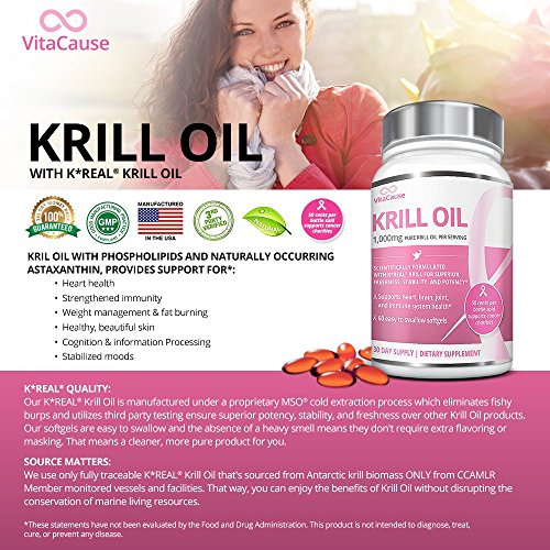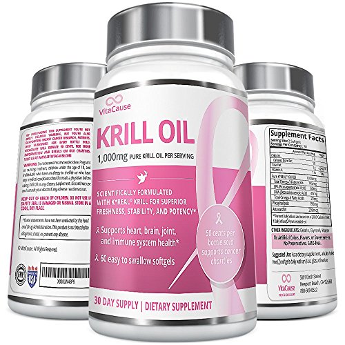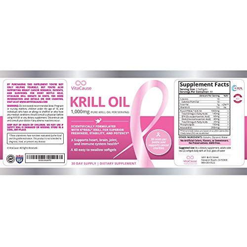 -. Binding : Health and Beauty -. Brand : VitaCause -. EAN : 0641871637720 -. Feature : OMEGA 3 + ANTIOXIDANT BLEND: Krill Oil provides unique support for heart, brain, joint, and immune system health with bioavailable Omega 3s. It also contains phospholipids to aid in absorption and Astaxanthin, a natural antioxidant that provides essential nourishment for the eyes, skin, and cells. / ADVANCED SUPER FORMULA OUTPERFORMS FISH OIL: In a double blind, place controlled published clinical study using similar levels of Omega 3 from Krill vs. Fish Oil, a significant improvement in Omega 3 index in subjects who took Krill Oil. / SUSTAINABLY SOURCED: We use only fully traceable K*REAL® Krill Oil that's sourced from Antarctic krill biomass by ONLY CCAMLR Member monitored vessels & facilities, so you can enjoy the benefits of Krill Oil without disrupting the conservation of marine living resources. / THE LATEST IN KRILL OIL TECHNOLOGY: Our K*REAL® Krill Oil is manufactured under a proprietary MSO® cold extraction process which third party testing has confirmed to ensure superior potency, stability, and freshness over other Krill Oil products. We formulate our supplements in GMP compliant manufacturing facilities in the USA. / HEALTHY LIVING FOR A CAUSE: By purchasing this supplement, you're not only helping yourself, but you're also supporting breast cancer research, patients, and survivors. For every bottle sold, VitaCause will donate 50 cents towards the cause. -. IsAdultProduct : 0 -. Label : VitaCause Suppelments -. LegalDisclaimer : These statements have not been evaluated by the Food and Drug Administration. This product is not intended to diagnose, treat, or prevent any disease. Actual product packaging and materials may contain more and different information than what is shown on our website. We recommend that you do not rely solely on the information presented and that you always read labels, warnings, and directions before using or consuming a product. Please see our full disclaimer below. -. Manufacturer : VitaCause Suppelments -. ProductGroup : Health and Beauty -. ProductTypeName : HEALTH_PERSONAL_CARE -. Publisher : VitaCause Suppelments -. Studio : VitaCause Suppelments -. Title : VitaCause Pure Antarctic Krill Oil with Astaxanthin and K-REAL® - 1,000mg per serving - 60 Liquid Softgels -. UPC : 641871637720