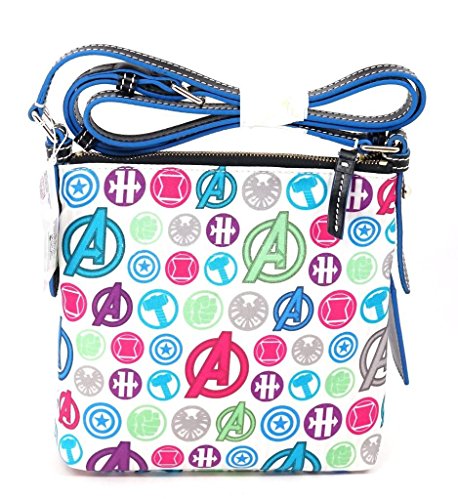 -. Feature : Exclusive item from the Walt Disney World theme parks. / P.R.Int pattern includes Avengers, Thor, Black Widow, Hawkeye, Captain America, and the Incredible Hulk icons / Nylon shell with genuine leather trim. Zip top closure with leather pull. Exterior slip pocket Interior zippered pocket / Two interior open pockets Interior leather key strap with toggle clasp. Fully lined / 8 1/4'' H x 8 1/2'' W x 2'' D Strap drop length: Adjustable - can be worn as a shoulder bag or a crossbody