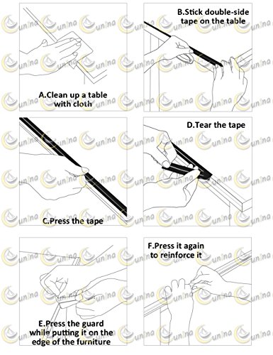 -. Feature : A.NO MORE WORRING the baby and enfant. Children have a strong curiosity and action, this product can help baby keep away from the sharp edges and corners, free to walk, run and play games at home without worried the pain and injury from hitting the furniture. / B.SAFE METERIAL AND BEAUTY. Made of safe PVC(polyvinyl chloride) material, Transparent and Beautiful, Reusable, Eco friendly and Safety for babies . Unlike the foam corner edge protector, it can not only protect the baby, but also keep the beauty of the furniture and our house. / C.EXTRA LONG AND SUITABLE FOR MANY FURNITURES. Being 6.6 ft length and Include a 16.5ft double-side tape, Suitable for a variety of furniture,such as table, refrigerator, wardrobe,desk,etc. / D.EASY INSTALLATION AND REMOVE. On the backside of the package, it has detailed and comprehensive instruction for everyone can be easy and simple to use. It can firmly stick to the furniture and easily removed without leaving a trade and damage furniture. / E.FLEXIBLE AND ODORLESS. Corner protect and Edge protect, Flexible and Odorless, think of everything to care your baby. Can be all-directional protect your baby as possible and like a kind protector.