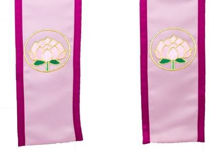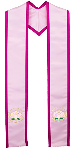This is a clergy stole made of 100% polyester Ultra Satin with the Lotus Flower symbol on the front. Comes in Black (with Fringe), White (with Fringe), Blue (Standard), Pink (with border), Purple (with Honor Gold Border Fringe), White (with White Border and Cream Fringe), White (With Cream Border and Black Fringe), White (with Rhinestones - Deluxe Dazzling version), White (Double White/Black Border with Black Fringe), and Red (With Black and White Double Border and Black Fringe). Our stoles are made using the highest quality fabrics and will be something that you will be proud to own for a lifetime. Washable 100% Polyester Heavyweight Bridal Ultra Satin Fabric. All Stoles are handcrafted by The Sash Company in the USA at our manufacturing facility in Upland, California. We take pride in the quality of our fabric, stitching, embroidery, and our customer service. We are the official sash company for Miss America pageants, and many universities throughout the United States. 0 |
