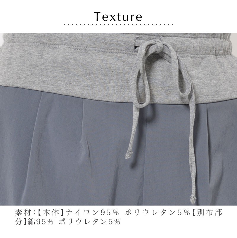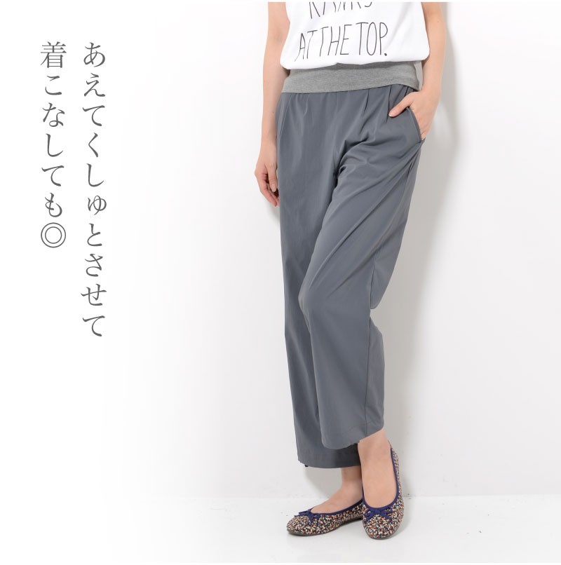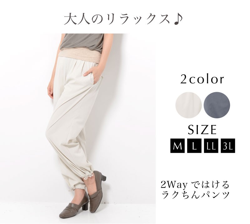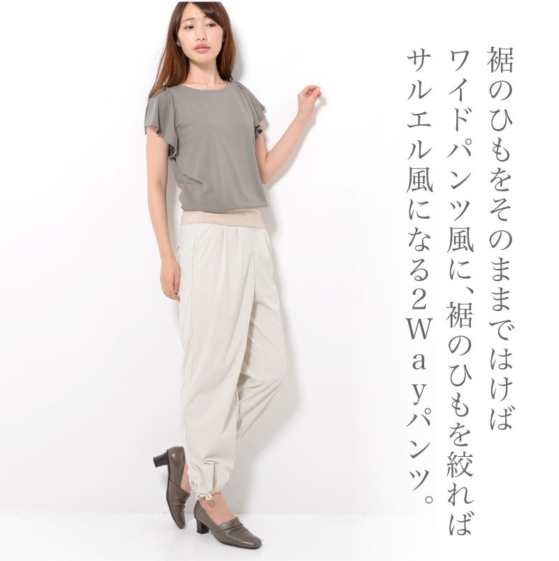 裾のひもをそのままではけばワイドパンツ風に、裾のひもを絞ればサルエル風になる2Wayパンツ。