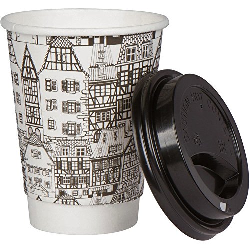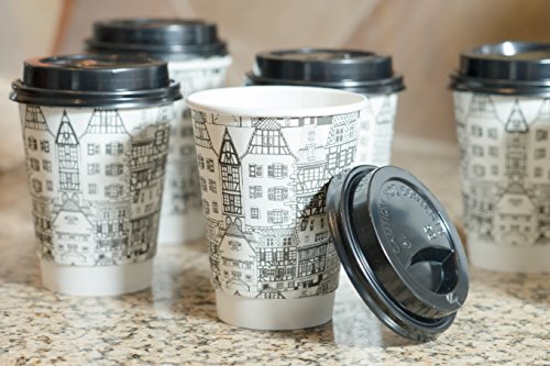 Coffee Paper Cups & Lids Set: 12 Ounce Disposable Mugs: Heavy Duty Decorative Printed Hot Drink Travel Cup & Kitchen Office Supplies: Insulated Double Walled Throw Away with Black Lids: Bulk 50 Count